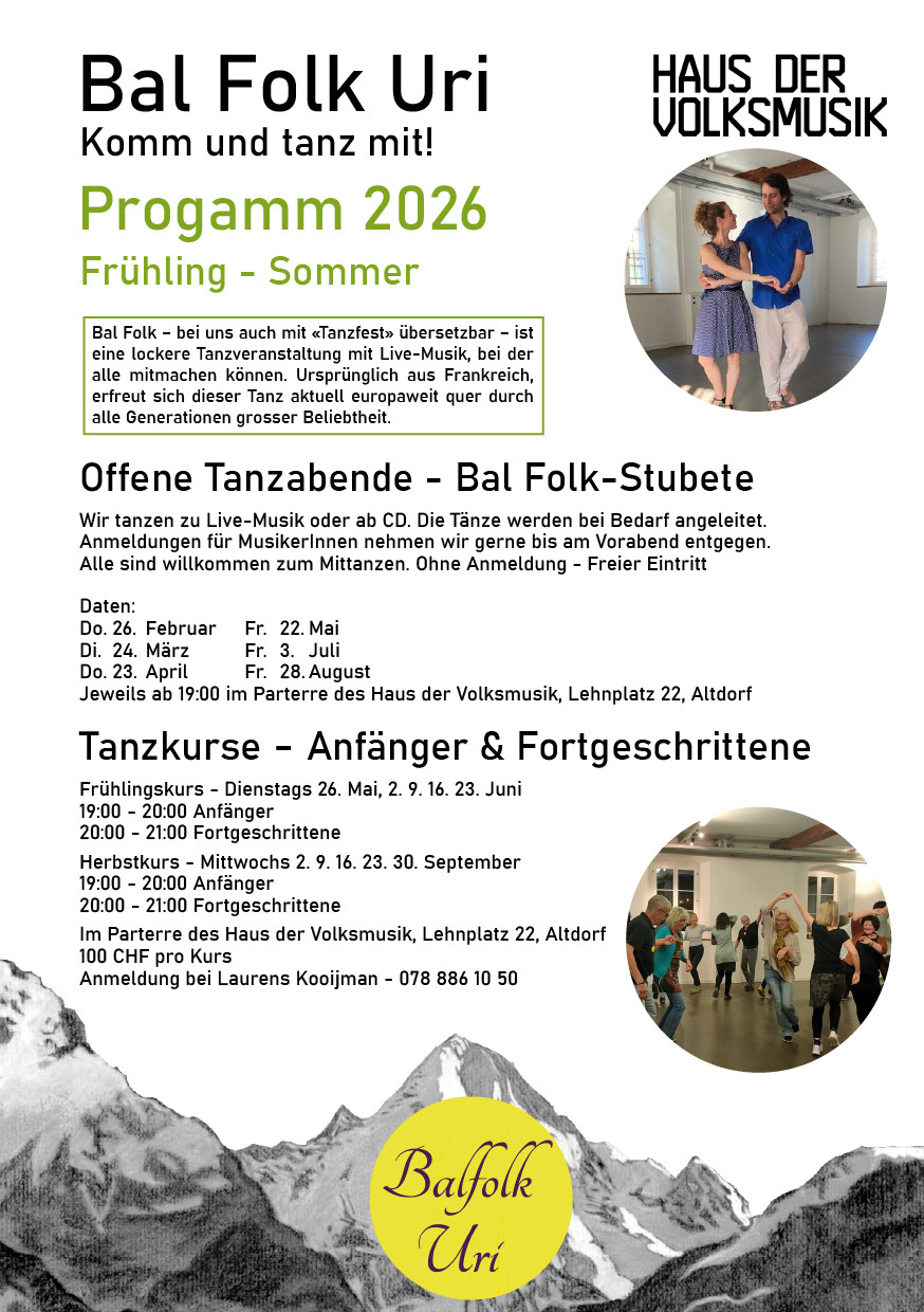 Wir tanzen zu Live-Musik oder ab CD. Die Tänze werden bei Bedarf angeleitet. Anmeldungen von Musiker:innen nimmt Bal Folk Uri (978 886 10 50) gerne bis am Vorabend entgegen.